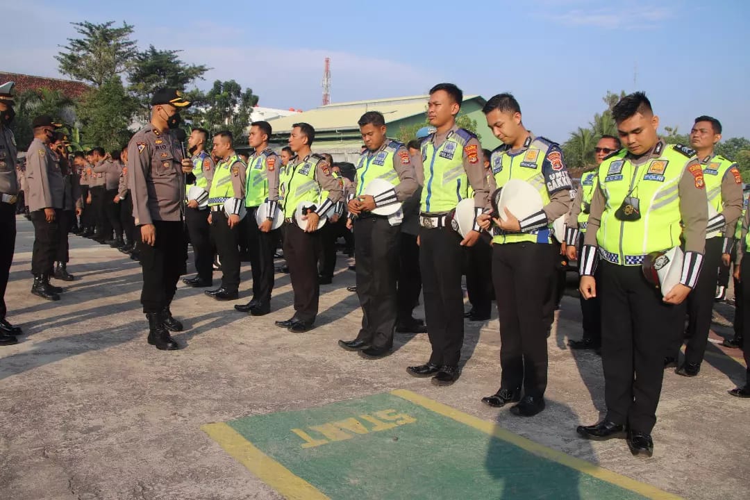 Kapolres Pringsewu AKBP Rio Cahyowidi, S.I.K., M.I.K, memimpin kegiatan apel jam pimpinan dan mendadak melaksanakan pemeriksaan sikap tampang (performance) para personel Polres Pringsewu, Senin (18/7/2022). (Istimewa)