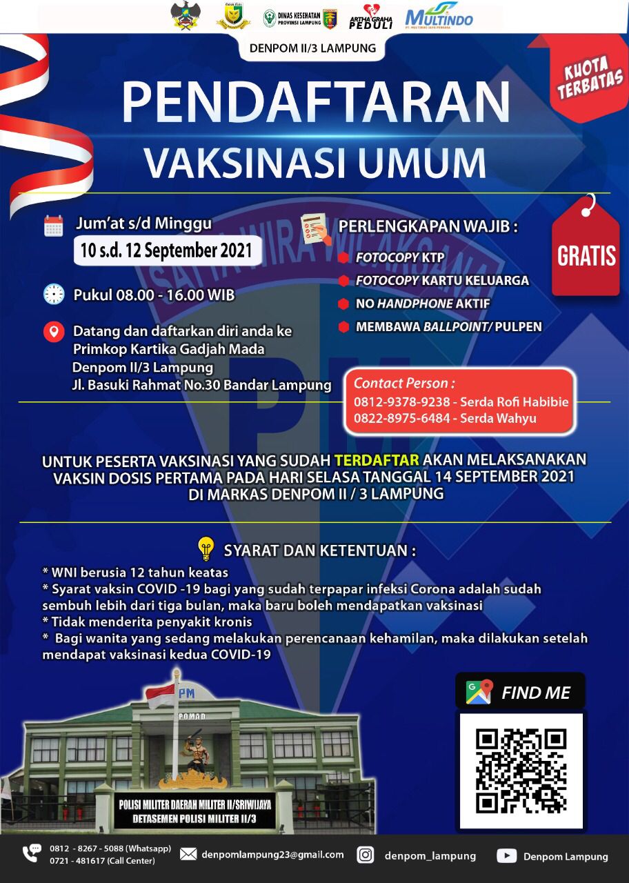 5W1HIndonesia.id, Bandar Lampung – Detasemen Polisi Militer (Denpom) II/3 Lampung saat ini tengah membuka pendaftaran vaksinasi yang diberikan secara gratis untuk masyarakat umum.
