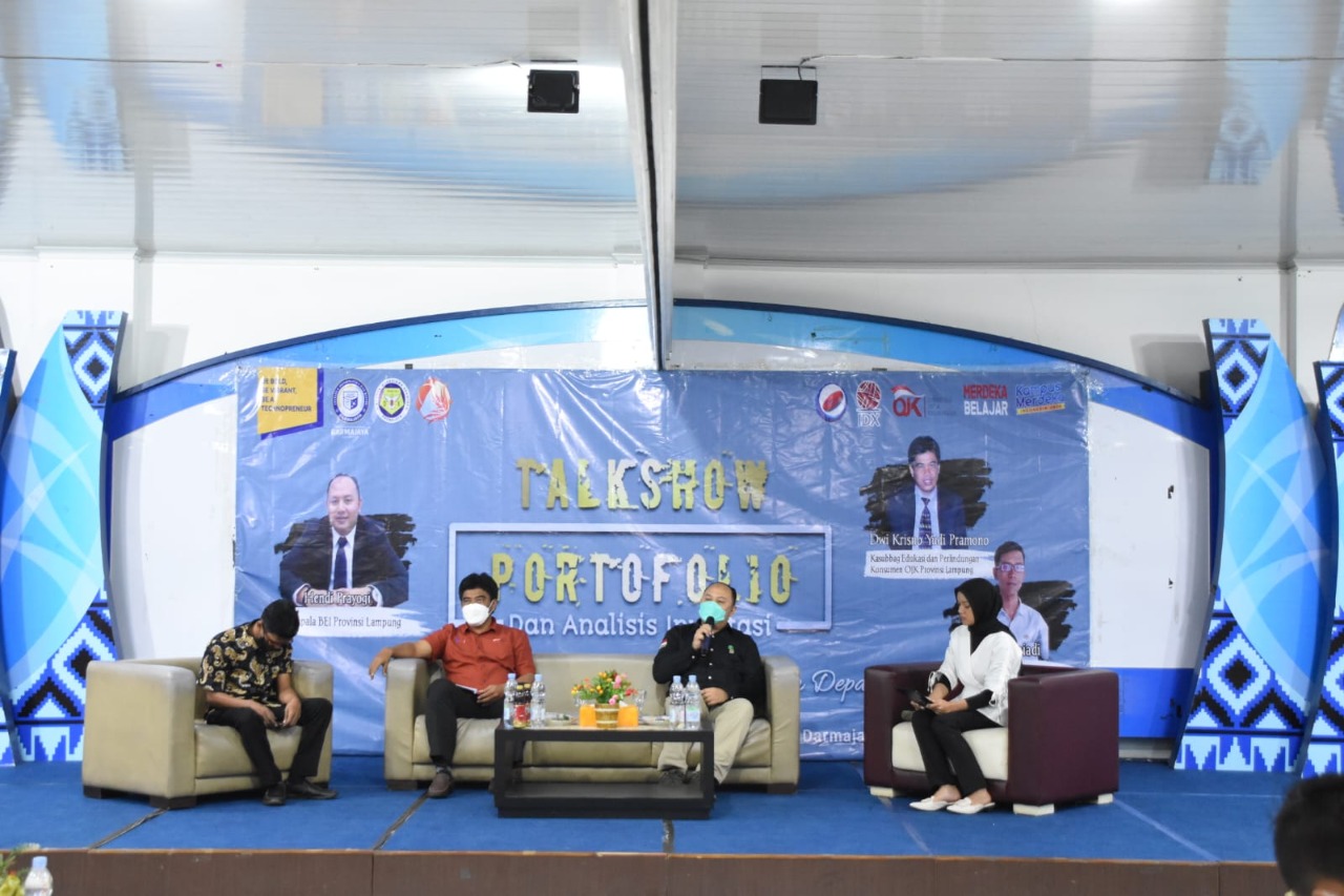 Talkshow mengangkat tema ‘Milenial Generasiku Investasi Masa Depanku’ dan diisi narasumber Hendi Prayogi (Kepala BEI Provinsi Lampung), Dwi Krisno Yudi Pramono (Kasubbag Edukasi dan Perlindungan Konsumen OJK Provinsi Lampung), dan Refa Risniadi (Perwakilan Phintraco Sekuritas).