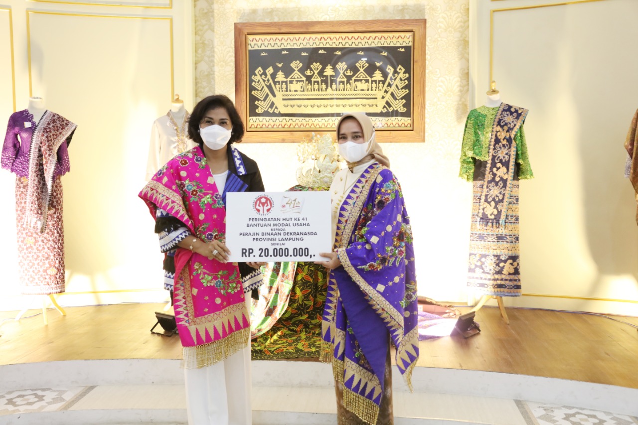 5W1HIndonesia.id, Bandar Lampung – Dalam rangka Hari Ulang Tahun (HUT) Dewan Kerajinan Nasional (Dekranas) Indonesia ke-41, Ketua Dekranasda Provinsi Lampung Ibu Riana Sari Arinal menyerahkan bantuan modal usaha dari Dekranas Indonesia kepada 10 perajin, di Gedung Galeri Tapis, Dekranasda Provinsi Lampung, Selasa (23/2/2021).