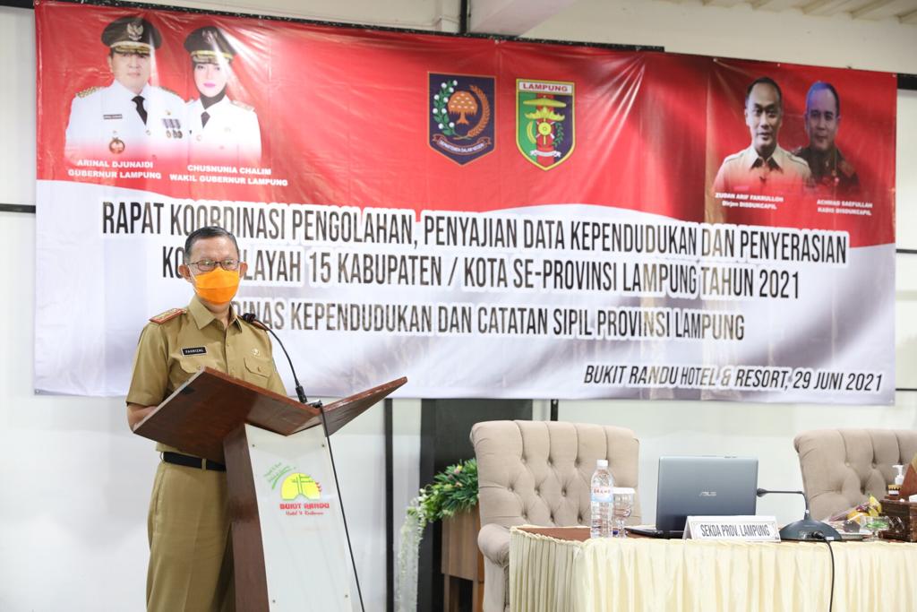 5W1HIndonesia.id, Bandar Lampung Sekretaris Daerah Provinsi Lampung Fahrizal Darminto membuka Rapat Koordinasi Pengolahan, Penyajian Data Kependudukan dan Penyerasian Kode Wilayah 15 Kabupaten/Kota se-Provinsi Lampung Tahun 2021 di Hotel Bukit Randu, Selasa (29/6/2021).