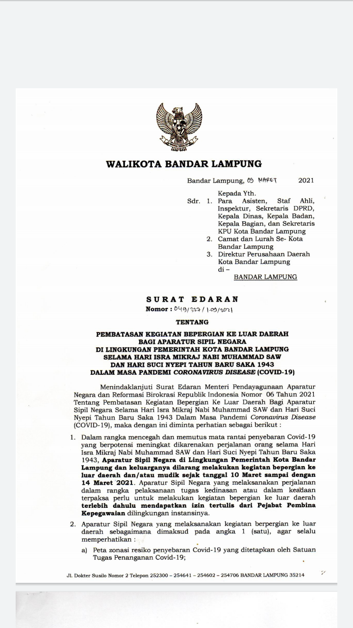 5W1HIndonesia.id, Bandar Lampung – Aparatur Sipil Negara (ASN) di lingkungan Pemerintah Kota (Pemkot) Bandar Lampung dan keluarga dilarang untuk melakukan kegiatan bepergian ke luar daerah sejak 10-14 Maret 2021.