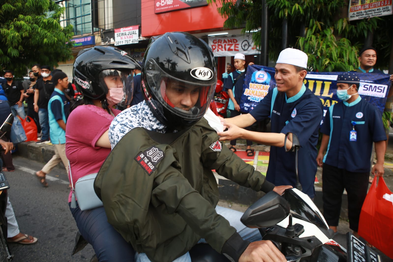 Pengurus Yayasan Ibu Sulaiman Al Faruq dan Pengurus SMSI Bandar Lampung bersama-sama turun ke jalan untuk membagikan 270 paket takjil kepada pengendara dan pengguna jalan di dua titik sepanjang Jalan Jenderal Sudirman.